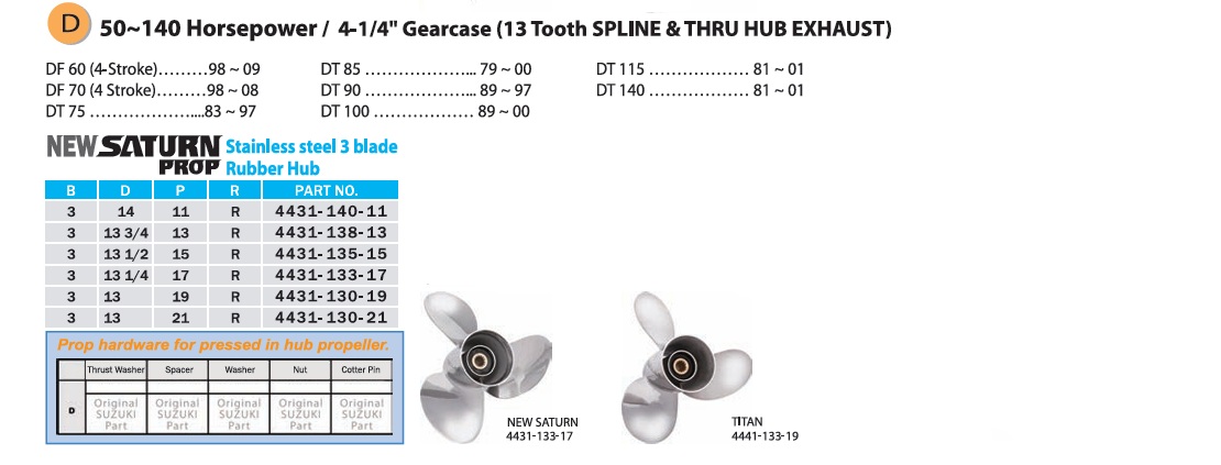 HELICE INOX NEW SATURN SUZUKI 13 CANNELURES DF60-DF70 DT75-DT140 13 X 21 RH 4431-130-21